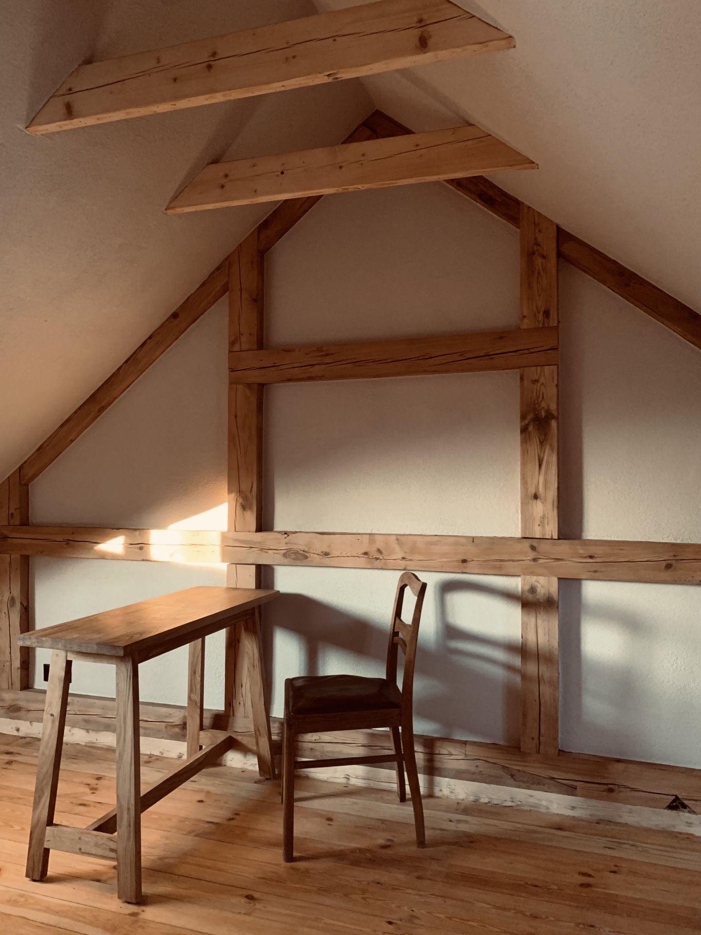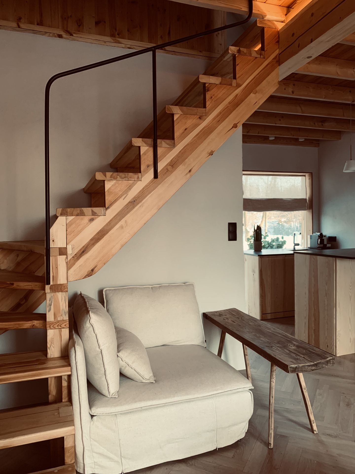 Zbudowany ze starego drewna, otulony glinianymi tynkami, zanurzony w ciepłych, naturalnych barwach. Światło zagląda tu od rana do wieczora, wypełniając wnętrza spokojem i ciepłem.